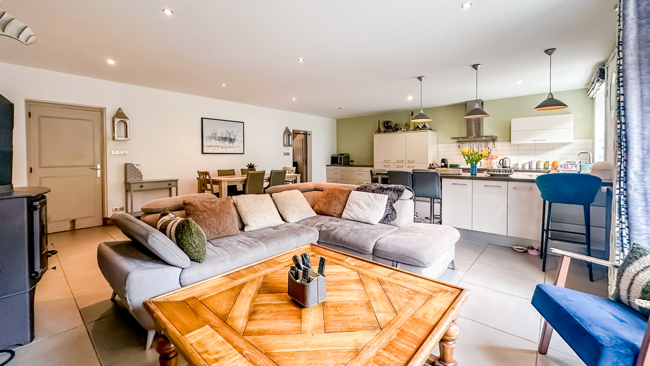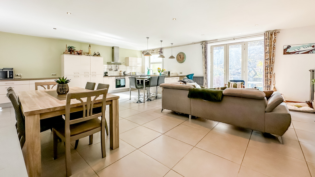 The main house features an entrance cloakroom leading into a spacious 53m² open-plan living area, combining dining and sitting spaces with a fully equipped kitchen offering ample storage. The sitting area leads to a south-east facing terrace and an additional south-facing garden, ensuring plenty of natural light and beautiful views of the garden and surrounding mountains. A WC and separate laundry room are accessed from the hallway, along with stairs leading to the first floor.
