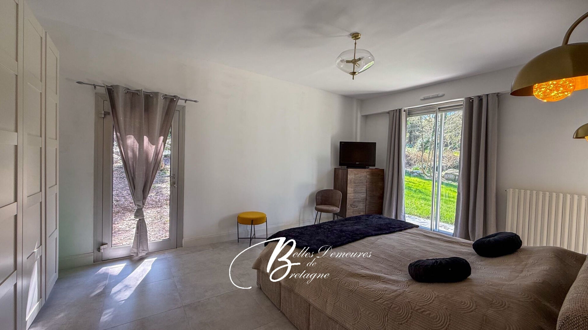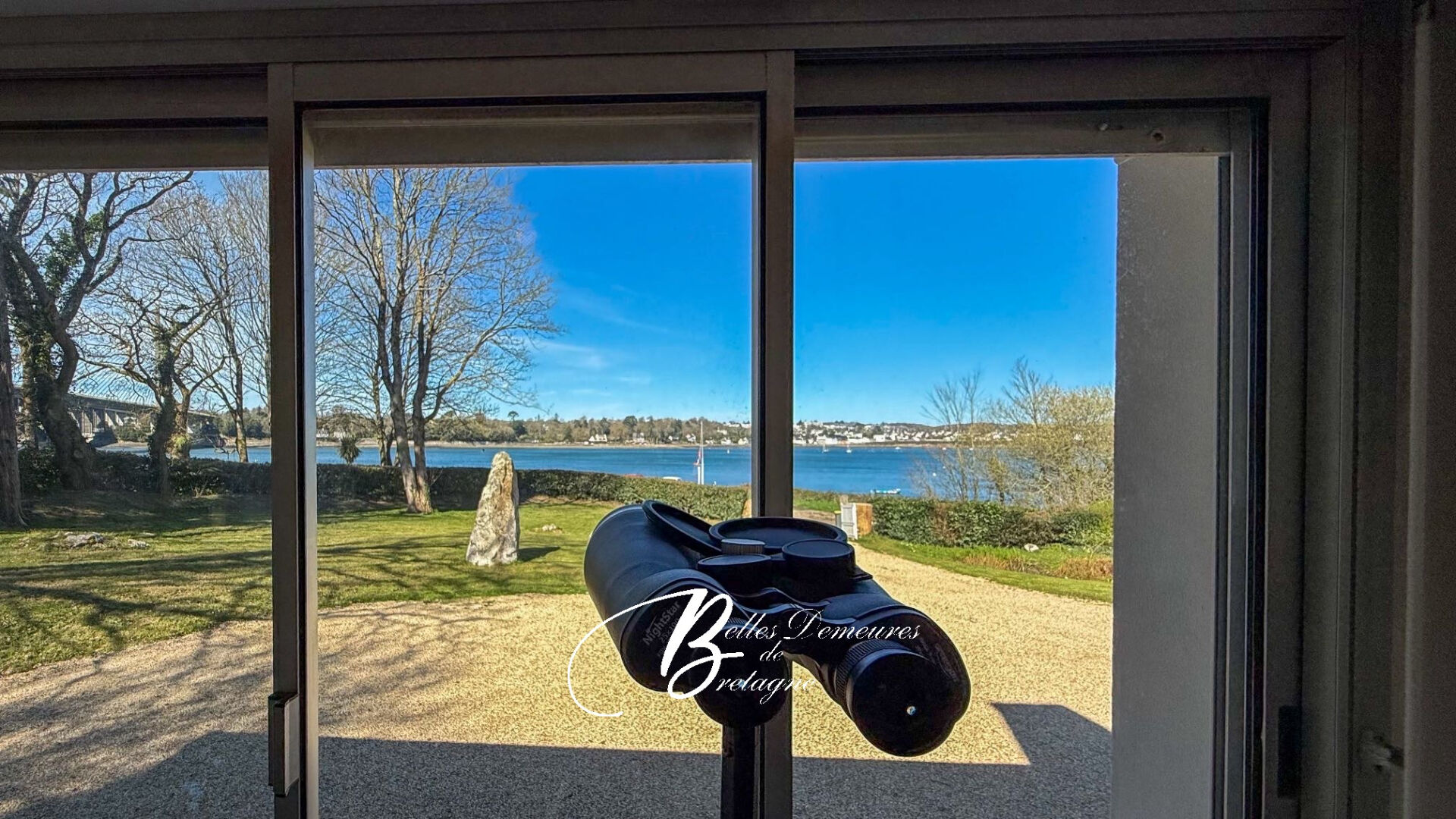 La vue, omniprésente, accompagne chaque instant. Depuis les salons, la salle à manger, la cuisine ou les espaces de détente, le regard glisse vers le jardin, les arbres, puis s'évade jusqu'à l'eau. Le spectacle change au fil des heures : lumière rasante du matin, la rade de l'après-midi, couchers de soleil sur la rade. Un tableau vivant, renouvelé chaque jour.