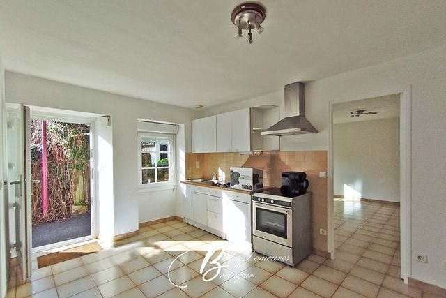 La maison, mitoyenne des deux côtés, donne sur une petite ruelle très calme. L'entrée se fait dans la cuisine-salle à manger, d'une surface confortable et équipée d'une cheminée. Donnant sur la cuisine, se trouvent une salle de bain, des WC et un placard.