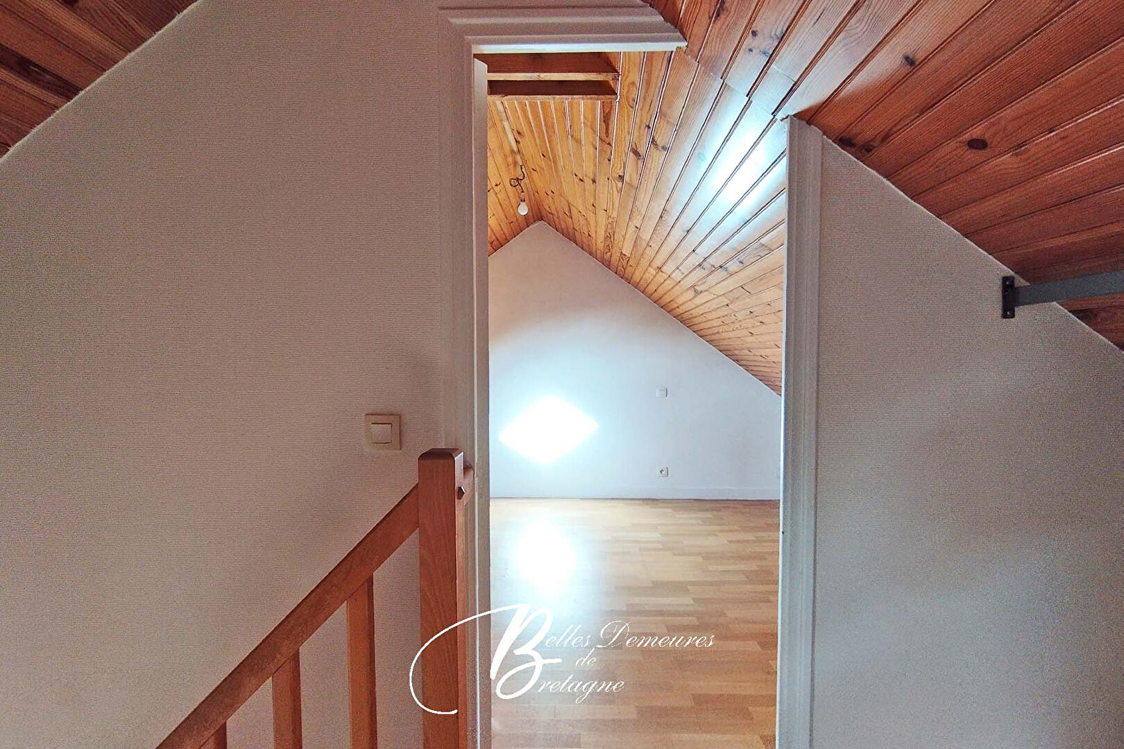 Également au rez-de-chaussée, la deuxième pièce de vie aux beaux volumes permet d'accéder à l'étage via l'escalier menant aux deux chambres sous les toits.