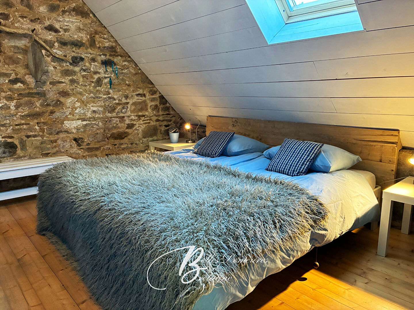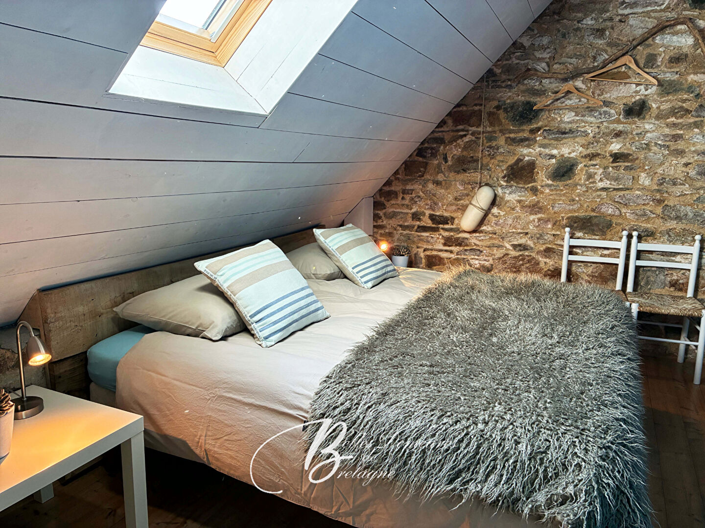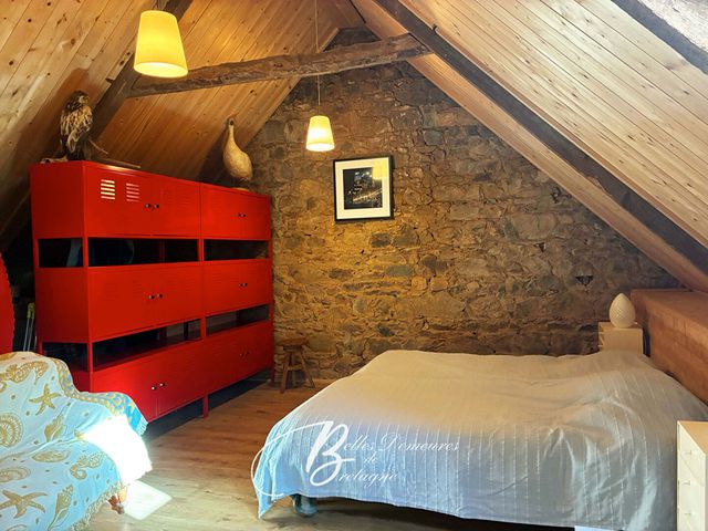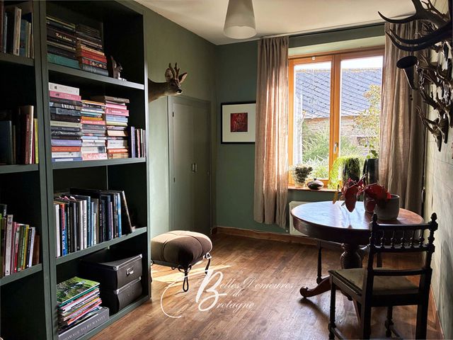 Dans le prolongement, une cuisine / salon avec poêle à bois, un espace épicerie / stockage, une bibliothèque, une grande chambre lumineuse ainsi qu'une chaufferie.