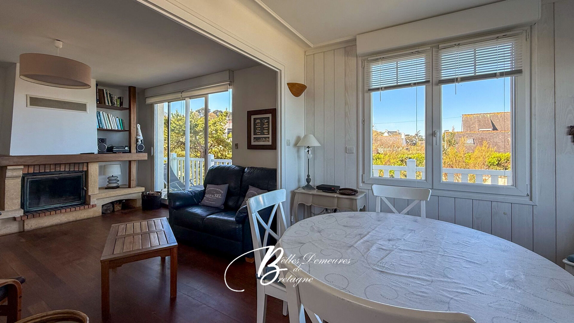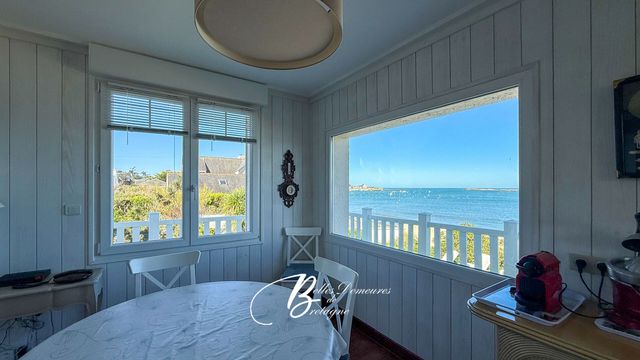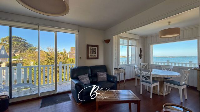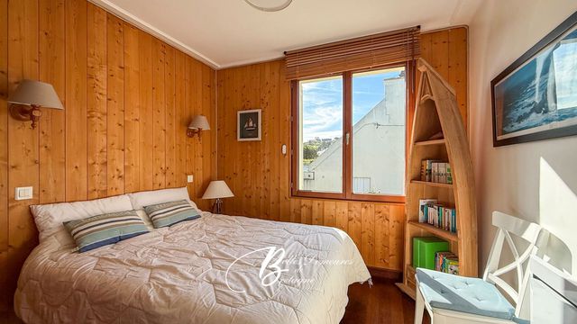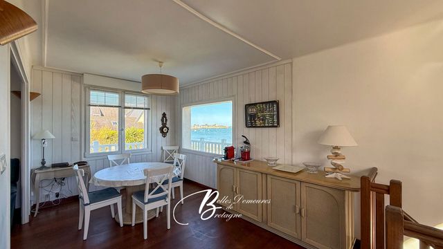 À l'étage, la pièce de vie, baignée de lumière, s'ouvre sur un panorama maritime fascinant. Elle accueille un salon-séjour avec cheminée, une cuisine équipée avec rangements intégrés, deux chambres, une salle d'eau et des toilettes. Le parquet massif, présent dans l'ensemble des espaces, confère une atmosphère chaleureuse et raffinée.