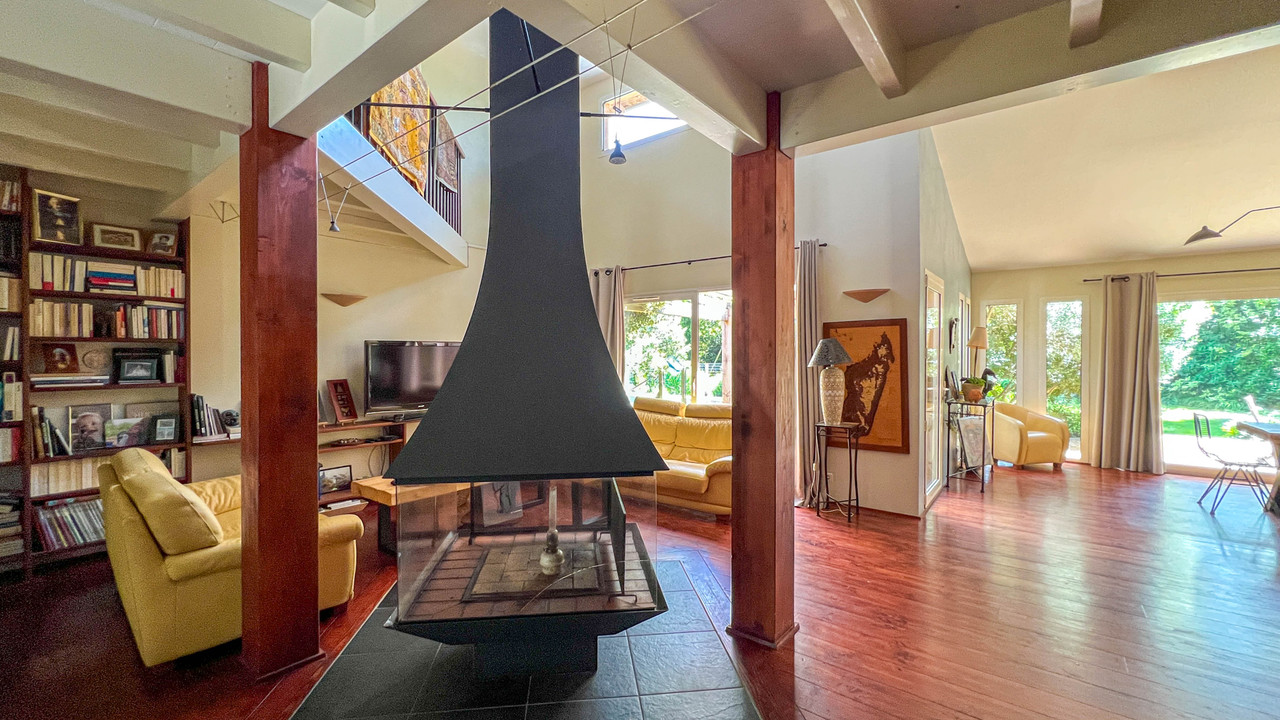 The heart of the home is a soaring 85 m² living space featuring a suspended fireplace, open-plan kitchen, and mezzanine, opening onto expansive wooden terraces and a magnificent heated saltwater pool (15 x 4.5 m).