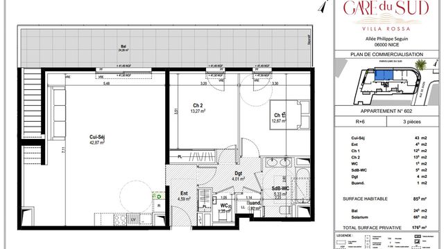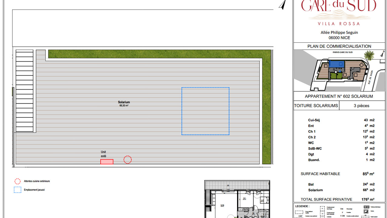 The living area consists of a large 43 m² living room with open kitchen, extended by a large 24.5 m² terrace, a true open-air room ideal for entertaining or relaxing with its 66 m² solarium.