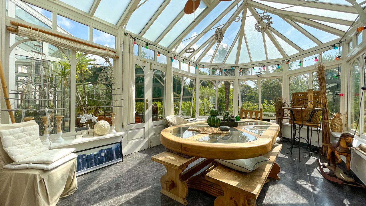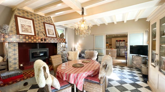 On the ground floor: entrance leading to a living room with original tile floor and beams; large bright dining room and fully equipped kitchen with access to the terrace. Office with access to 2 conservatories, WC and shower room.