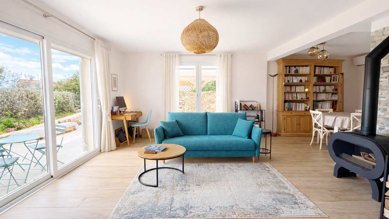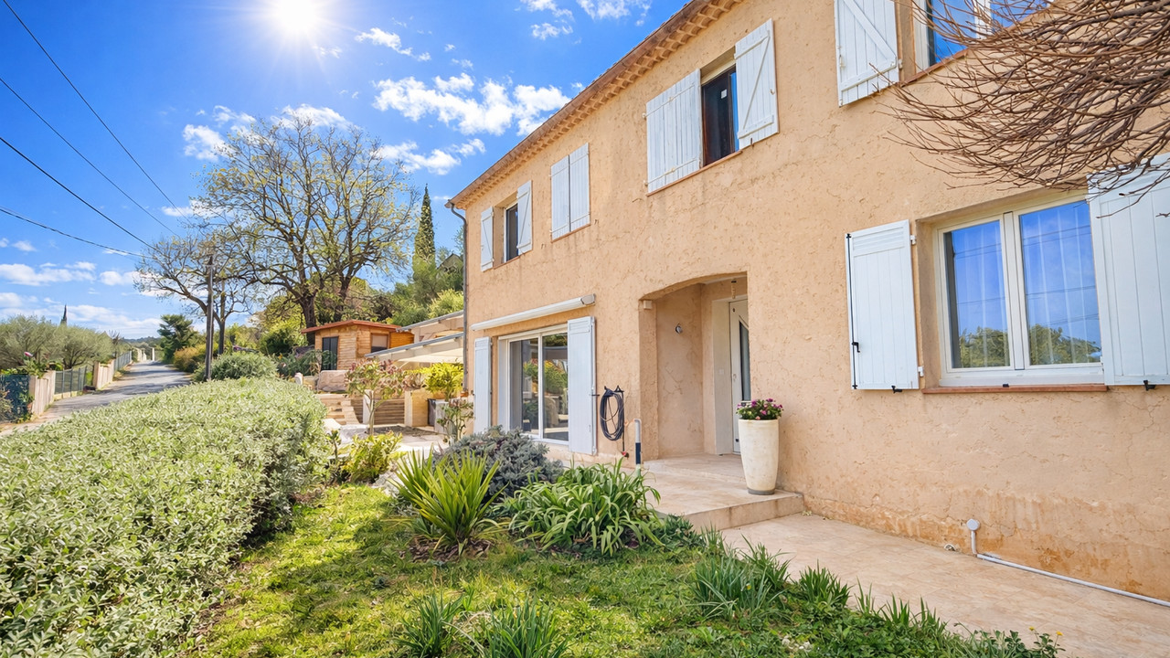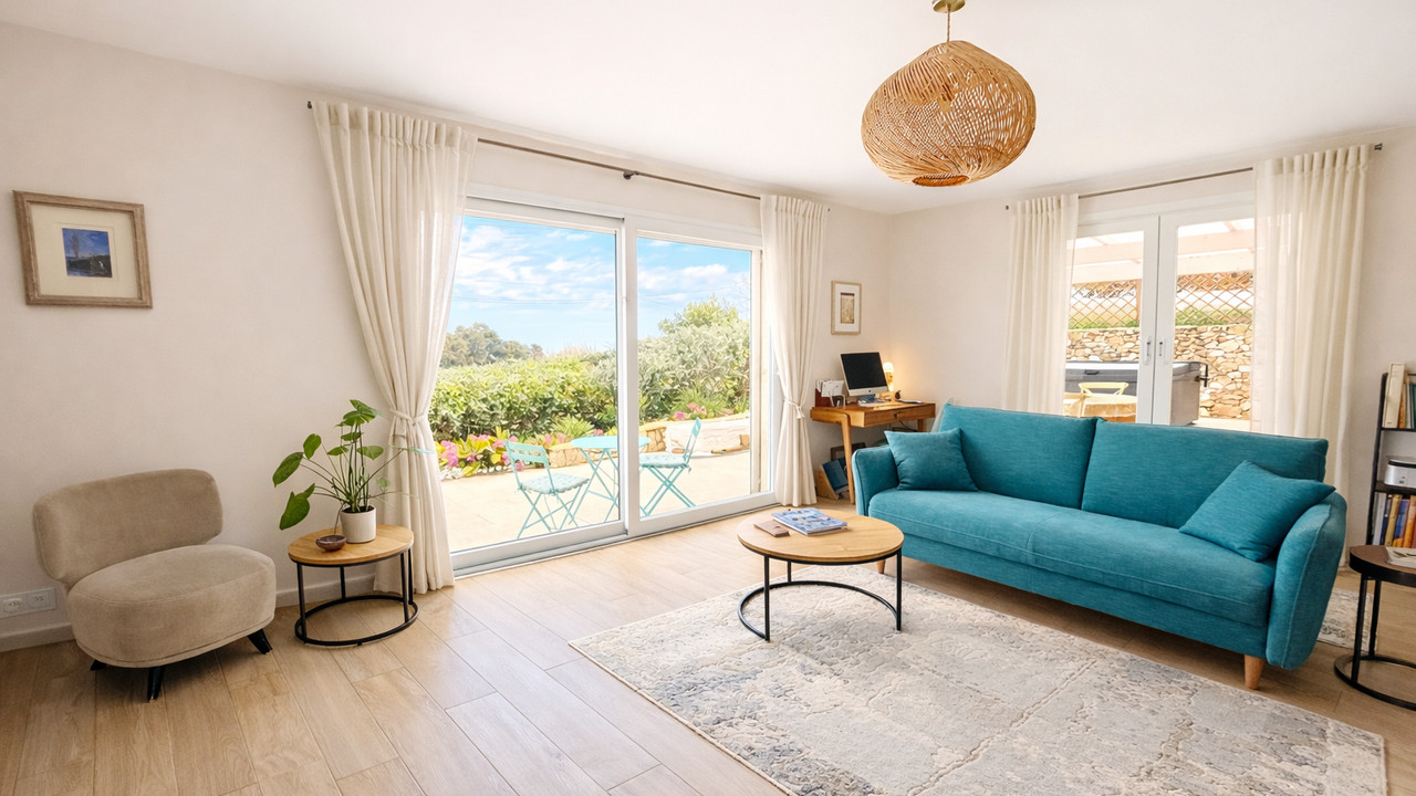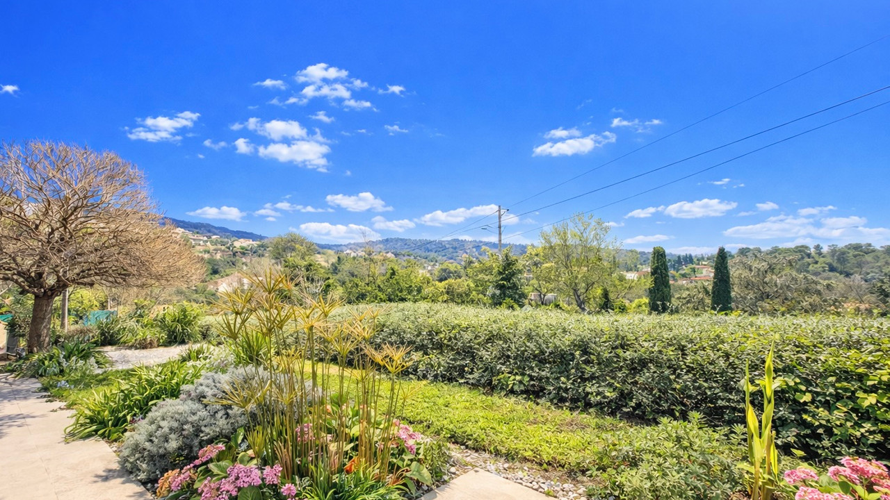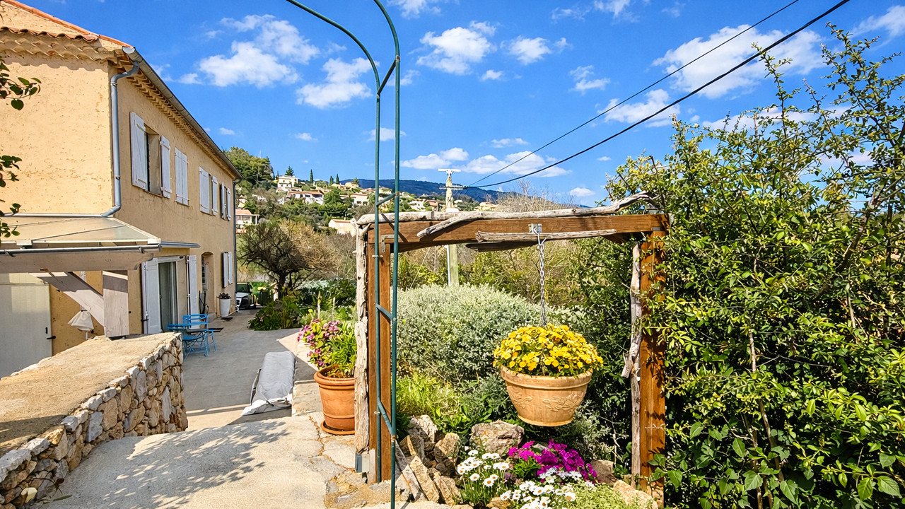 With south to south-east exposure, the property enjoys open views over the surrounding hills with a glimpse of the sea. The living areas open onto a spacious 72 m² terrace and a private landscaped garden of approximately 511 m², featuring a new chalet, outdoor storage and a gate at the end of the garden.