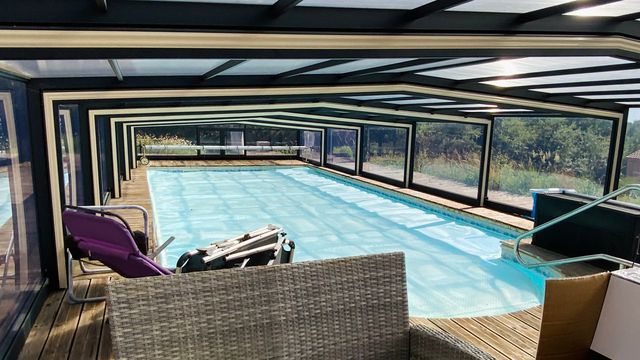 Outdoors, a heated 11 x 6 m pool with wooden decking, an outdoor pizza oven, orchard, vegetable garden, and stable boxes create a dream rural lifestyle.