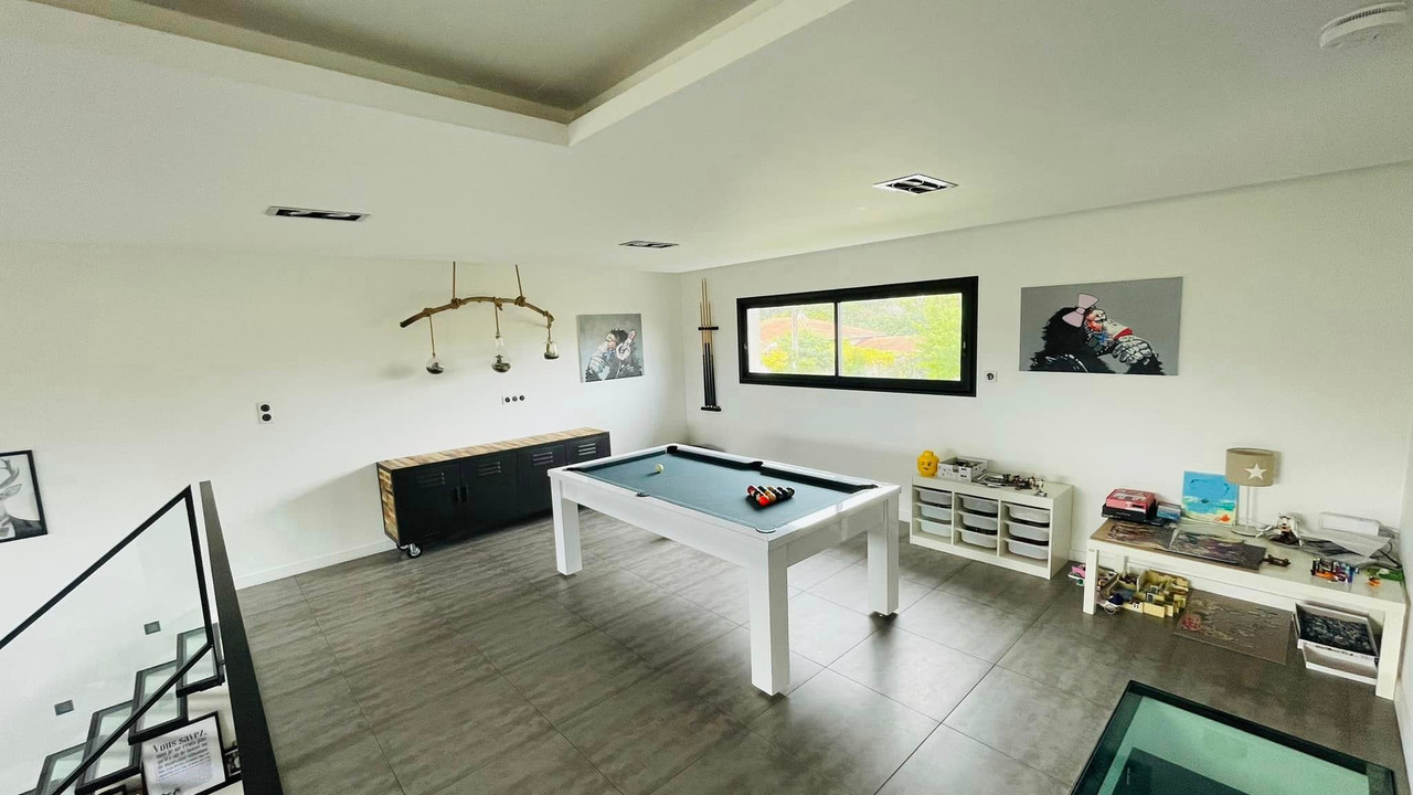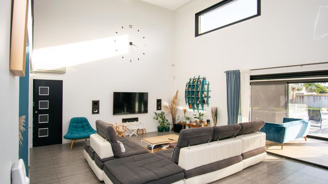 Main living area with a 5.30 m high ceiling, providing brightness and a spacious feel.