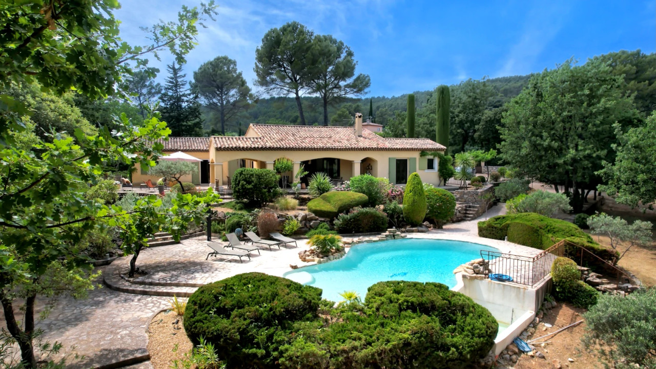 A39845GWI83 - Cotignac. Between the Gorges du Verdon and the Côte-d'Azur, Cotignac is certified most beautiful village of France since 2022. Close to the village and all amenities, lovely Provençal house set in the heart on superb plot more than 4 100 sqm, planted with Mediterranean trees. Privacy, quiet, it offers an open view on the surrounding countryside. Nice pool, summer kitchen with storage room, shower room and toilet. Entrance, spacious living / dining room with a chimney, this light room opens on a large terrace to the South-East, pretty open and fully equipped kitchen with dining space, laundry room, storage room, a spacious main bedroom, with cupboards, opening on a lovely patio, private shower room and toilet. Another bedroom with cupboards, private bathroom and toilet. On the other wing of the house two other bedrooms, 2 shower rooms and toilet. Carport, and parking