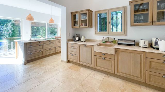 The kitchen has been recently renovated and leads out to the swimming pool and terrace.