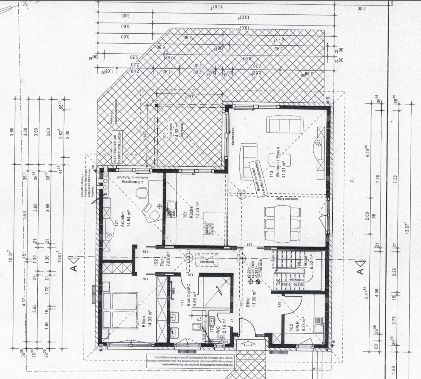 Vanuit de woonkamer, keuken en werkkamer leiden grote glazen schuifdeuren naar het circa 70 m² grote terras.