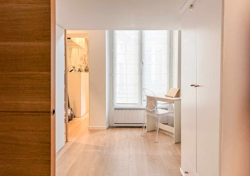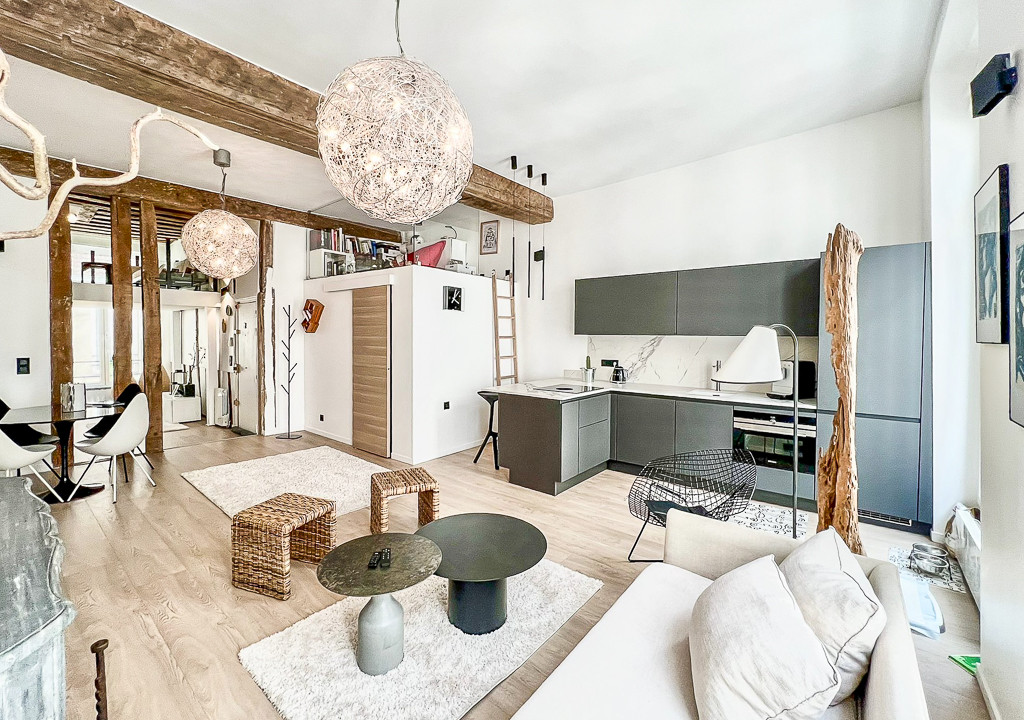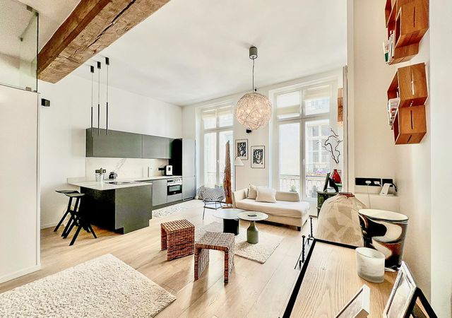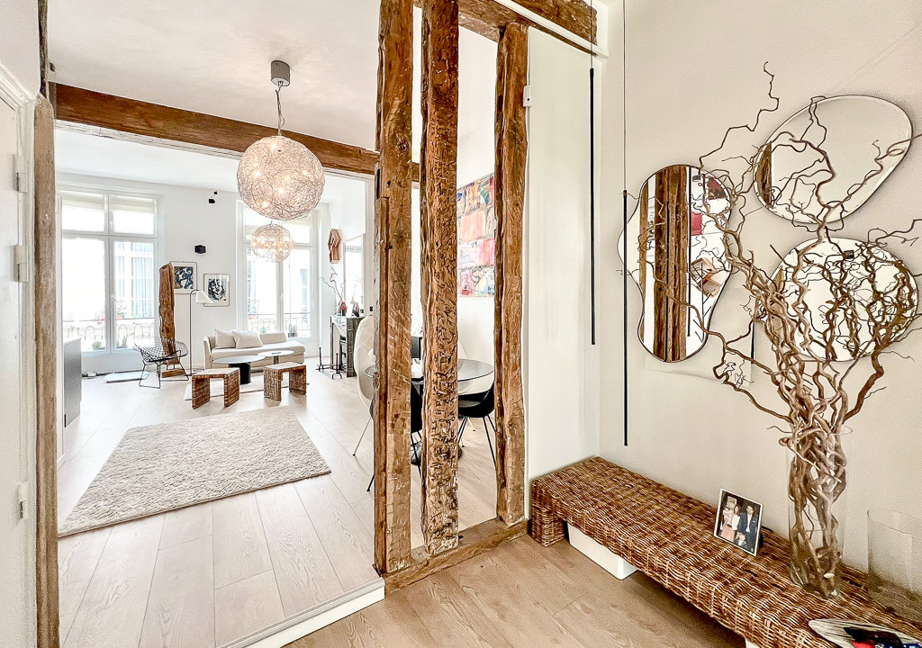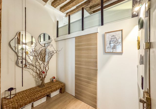 A41448HHE75 - In a charming 1650 building on a peaceful side street, this beautifully renovated second‑floor apartment blends period character with modern comfort. The generous 13 m² entrance with custom storage and a mezzanine leads to a superb 31 m² open‑plan living space featuring 3.4 m ceilings, a marble fireplace, exposed 17th‑century beams, and a contemporary American kitchen. A shower room with WC (3.5 m²) and smart mezzanines optimize the footprint.