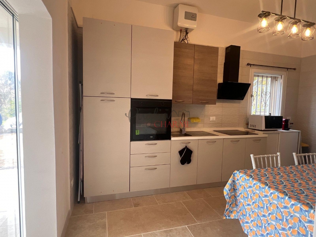 De glazen deur van de keuken geeft toegang tot een functionele veranda, ideaal om op zomerse dagen buiten te genieten.