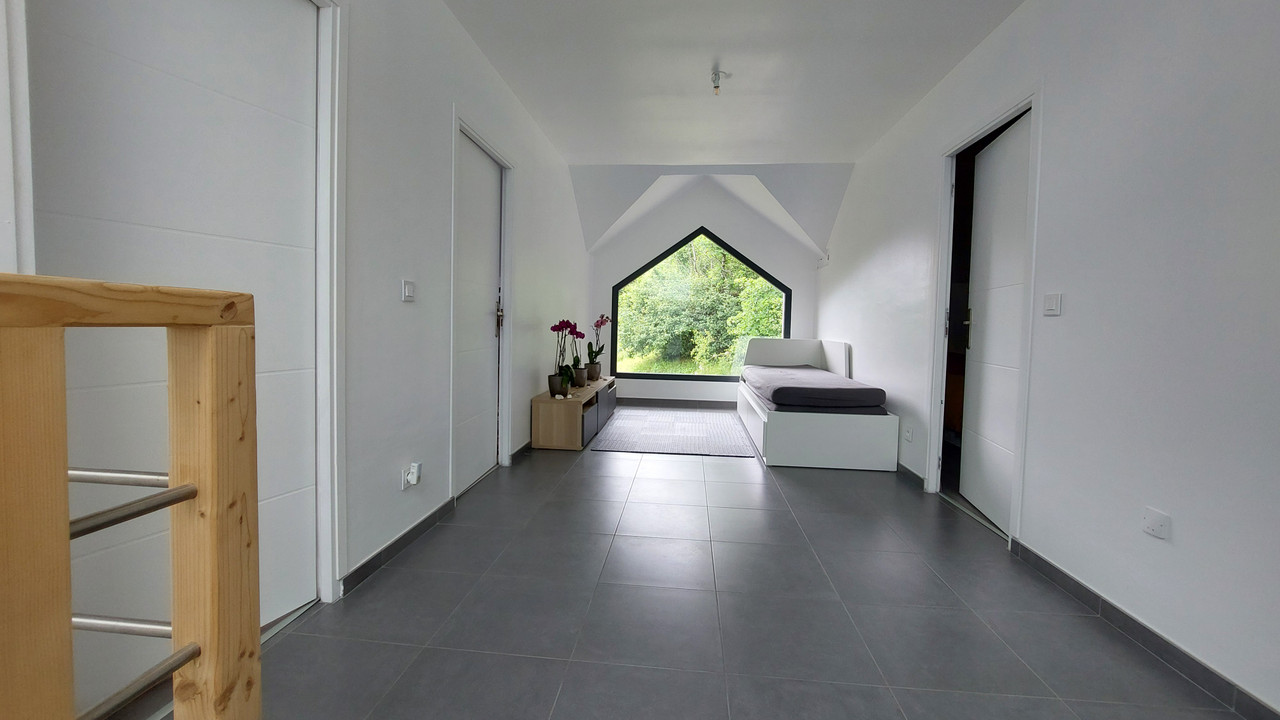 Heating and electricity are provided by a solar pannels and a thermodynamic heat pump supplemented by a pellet burner. The installation and construction give the house a grade B with regards to energy conservation resulting in low running costs.