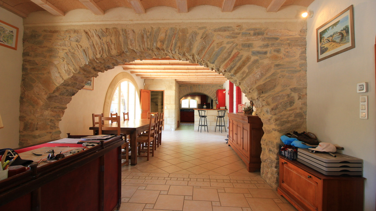 A30888MRW34 - Discover this unique property 220m2, perfectly positioned in a breathtaking, privileged location just a few km from one of France’s most beautiful villages. Accessible via a private driveway, the main property features a spacious open-plan living area that includes a sleek, modern kitchen, large lounge/with an ornate fireplace. A striking spiral stone staircase leads you to the first floor, where you’ll find three double bedrooms, each with its own bathroom and stunning views over your private land.