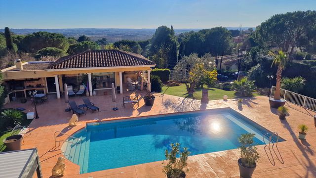 The exterior boasts a heated 12x6 pool with safety cover, spa with bioclimatic pergola, enclosed air-conditioned summer kitchen with bar and barbecue, pétanque court, and an independent 80 m² space.A vast 200 m² garage includes a utility room, wine cellar, and workshop.
