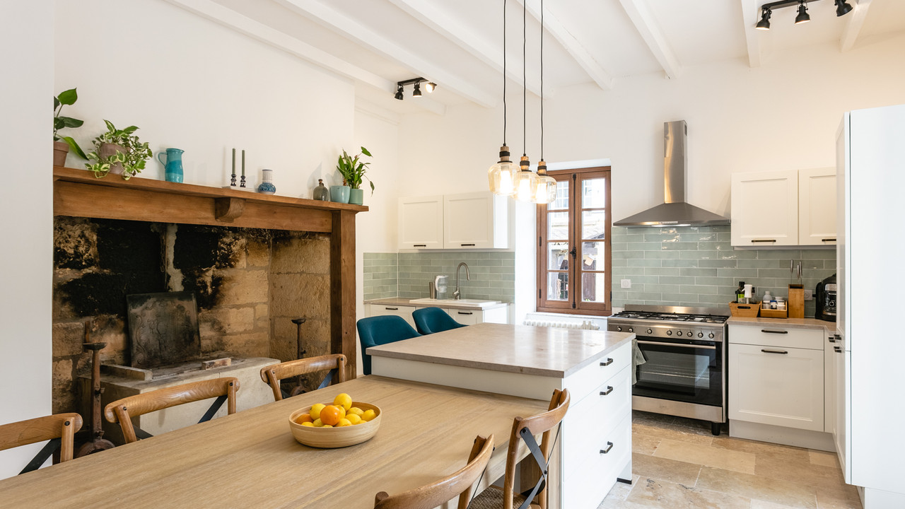 At its heart lies a stunning 64 m² open-plan kitchen, dining and living area with travertine flooring and a feature inglenook fireplace