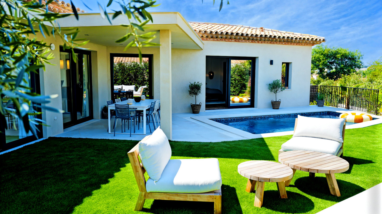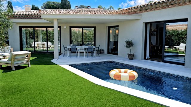 A42067JTO83 - À proximité du centre-ville de Sainte-Maxime, villa contemporaine de 2025 offrant suites élégantes, vaste séjour lumineux, jardin paysager avec piscine et prestations haut de gamme. Une propriété clé en main alliant raffinement et emplacement.