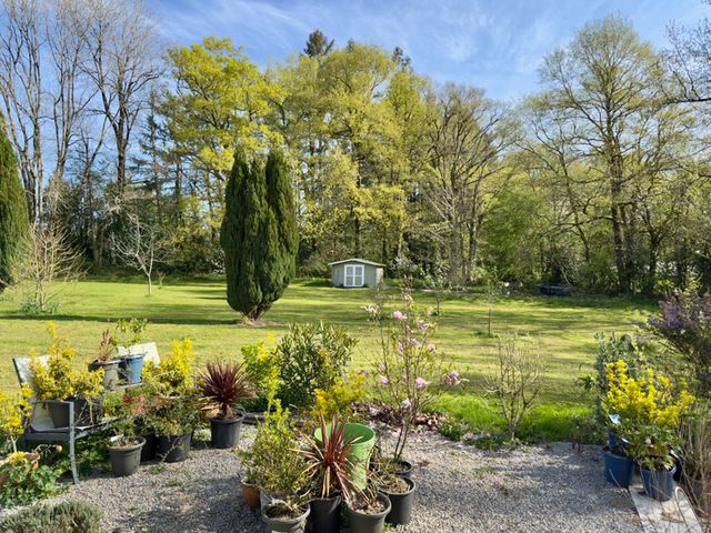 De fraai aangelegde tuin, gelegen op het zuiden, beslaat circa één hectare en is volledig omheind. Het huis beschikt over een atelier (momenteel in gebruik als schildersruimte) met elektriciteit en wateraansluiting, evenals een schuur (gebouwd in 2019) met elektriciteit en water. Daarnaast is er een ondergrondse regenwateropvanginstallatie van 3.000 liter voor de irrigatie van de tuin.