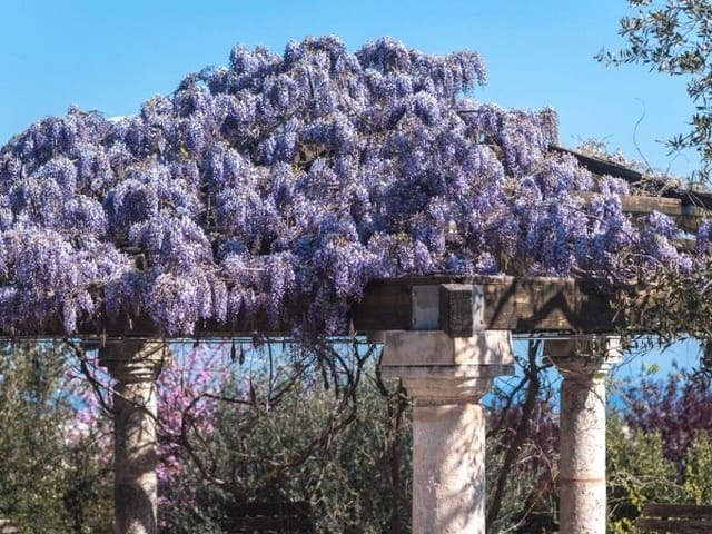 The land consists of a 1,000 m2 garden with ornamental plants, Mediterranean vegetation, and ancient olive trees.